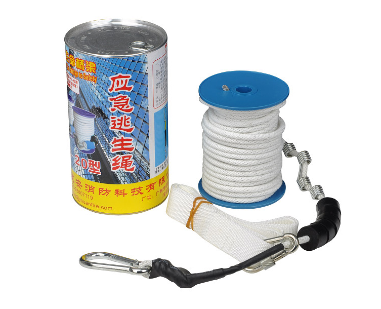三、使用方法: 一旦建筑物发生火灾,无法从安全通道口出 逃,应立刻打开包装,取出逃生绳,将逃生绳一 端安全钩悬挂在窗口或牢固固定在建筑物上,然 后迅速从窗口逃离火灾现场。绳子粗为8毫米,钢芯粗为3毫米,绳长20米