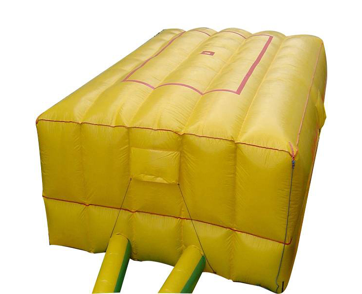 救生气垫作紧急逃生用,采用具有阻燃性能的高强纤维材料制成,充气后气垫高 2.20m , 平面面积最大可达 48m2 , 顶面中间部位设有红色标志和反光标志,使逃生者易于看准目标跳下。